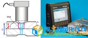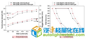 车身轻量化的发展趋势促使许多轻质高强钢被引入到车身制造业中,新材料的应用一方面降低了汽车自重,另一方面也给连接技术及接头质量检测技术带来了一系列问题。使用新型的伺服焊枪和中频逆变直流控制器能够很好的稳定焊接过程,提高焊接质量,而无损检测技术很好地解决了质检中的问题。 随着全球环境和能源危机的日益加剧,节能减排逐渐成为新一代轿车设计和制造中面临的重要问题。大量研究表明:燃油消耗的50%是由汽车的重量引起的,当整车质量减轻10%,汽车的燃油经济性可提高3.8%,CO2排放量减少4.5%。因此,减少汽车自身重量是降低燃油消耗的最有效措施。车身的轻量化技术是现代汽车技术发展的一大主流。 据一项新近的项目研究表明,使用轻质高强材料可以将车身减重25%。目前,高强钢的使用约占车身总用钢量的30%左右,而这个比例还将进一步扩大。通常来说,把高强度钢板分为普通高强钢(HSS)和超级高强钢(AHSS)。根据国际上对超轻钢汽车的研究,把屈服强度在210~550MPa范围内的钢板称为高强度钢,屈服强度大于550MPa的钢板称为超高强度钢。其中,普通高强度钢主要包括高强度无间隙原子钢(IF)、铝镇静钢(AKDQ)、烘烤硬化钢(BH)和高强度低合金钢(HSLA);超级高强度钢主要包括双相钢(DP)、相变诱发塑性钢(TRIP)、马氏体钢(MS)等。高强钢中的BH、IF高强钢主要用作车门、引擎罩、挡泥板和悬挂件等;DP和TRIP用作内板、底板和车轮等;马氏体钢(MS)用作保险杠、门梁等。图1为各种先进高强钢的延展性和强度特性对比,由此可见,双相钢具有较高的强度和较好的延伸率,已经成为车身制造中应用前景最广泛的一种新型材料。 双相钢广泛应用在降低车重的同时,也给车身连接装配提出了新的要求。电阻焊作为车身制造中最重要的连接工艺之一,双相钢的点焊质量控制和检测也变得越来越重要。传统的气动焊枪的电极压力由气缸驱动,无法得到精确控制和保证,老式的交变电流焊机焊接电流不平稳,且受网压波动影响较大,已经逐渐无法适应新材料的焊接。近年来,新型伺服焊枪使用伺服电机驱动电极,能够精确控制电极压力。中频逆变直流(MFDC)焊机以其快速的响应速度、平稳的电流控制,得到越来越广泛的重视,为新材料的焊接质量控制提供了良好的解决方案。 双相钢焊接工艺改进 双相钢由于制备时采用特殊的相变强化处理工艺,从相图上看,其马氏体相变临界曲线偏左,在进行电阻点焊时,熔化后的高温奥氏体在保压过程中,冷却过程曲线会穿越其马氏体相变临界区域,致使焊后熔核中形成不同含量和分布的马氏体,导致熔核区比较脆,焊点十字拉伸强度及低周疲劳性能都不佳。采用常规的气动焊枪和交流焊机进行焊接时,由于无法控制电极压力及电流波动,为了保证焊接质量,通常采用比较大的焊接电流,会造成焊接时产生很大的飞溅。新型伺服焊枪和中频逆变直流焊接电流控制器的引入,使焊接过程中的电极压力和电流控制成为可能。 上海通用现场的伺服焊枪有C型、X型和P型,以C型枪为例,其结构如图2所示。与传统气动焊枪相比,伺服焊枪使用伺服马达来带动滚珠丝杠(Ball screw)或杆型丝杠(Roller screw)旋转,以驱动电极杆直线上下运动,实现加压和焊接的全过程。由于伺服马达的数字化控制,与传统气动焊枪相比,伺服焊枪有如下特性: 1. 电极运动位置和速度精确可控,一方面可实现与工件的软接触,减少冲击噪音,并延长电极寿命;另一方面,使电极打开幅度可控,机器人运行轨迹可实现最优化,减少不必要的行程。 2. 整个焊接过程中的电极压力可控,其压力调节速度可达200kgf/cycle(10kgf/ms),能够很好地避免和抑制飞溅,有效保证和提高焊接质量;在进行管板焊接时,电极压力可调的特性能够减少管的焊接变形,防止裂纹产生。 3. 采用伺服焊枪电能的消耗成本低于压缩空气的消耗成本,可以达到节能的效果。 4. 通过伺服电机编码器反馈的动态电极位移信息可间接反映焊点质量,为焊点质量在线监测提供了可能。 中频逆变直流焊机(MFDC)是将工频(50Hz)交流变换为中频(1 000Hz)直流输出,时间分辨率比工频提高,控制精度也提高,并且输出电流不受次级输出回路变化影响,热效率也较高,输出功率也很大,焊接质量也更好。与传统交流焊机相比,有如下特性: 1. 焊接质量:工频交流焊机的调节周期较长,对50Hz的电网,焊接时间调节分辨率为20ms。逆变直流点焊机时间调节分辨率可达1ms(1 000Hz逆变频率),控制精度高。逆变焊机反馈控制的响应速度明显加快,输出稳定性好。工频交流焊机由于电流过零的影响,热效率低,用晶闸管调节电流,当电流百分比偏小时,过零时间长,影响更大;逆变直流点焊机输出电流为脉动直流,在回路电感的作用下为连续直流输出,热效率高,焊接热输入稳定。 2. 焊接速度:工频交流焊机因电流过零的影响,加热时间相对较长。逆变电阻点焊机为直流输出,加热集中,焊接时间缩短。 3. 节能效果:工频交流点焊机工作在50Hz,变压器损耗大,焊机功率因素低,回路损耗大。逆变焊机变压器工作在较高的频率,损耗很小,直流输出改善功率因素,节能效果明显。 4. 设备体积与重量:工频交流焊机的变压器铁心较大,同样功率条件下设备较笨重。逆变直流电阻点焊机变压器大大减小,设备较轻巧。 使用伺服焊枪+中频逆变直流焊接控制器与传统气动焊枪+交流焊接控制器,在焊接