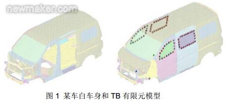3 基础模型分析 3.1 有限元模型描述 利用HyperMesh建立白车身和TB有限元模型,分析模型采用Shell单元建模,焊点用reb3+bar+reb3单元模拟,总装螺栓采用Rbe2+CBar模拟。如下图1所示。
