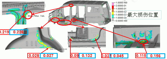对料厚优化结果进行模态、刚度、强度、耐久等领域验证。经过多学科验证,选取的料厚满足性能目标要求,方案可行,车身重量减轻了4.8Kg。 4.2.1 模态和刚度结果 由下表对比分析可知,弯曲和扭转刚度下降1.5%左右,一阶扭转模态基本没有影响; 表 2 弯曲扭转刚度和模态对比分析结果 1、前轮毂包疲劳损伤图示,最大损伤出现在前轮毂包与A柱前端连接位置,损伤值为0.028; 2、前门框左侧下角点疲劳损伤图示,损伤值为0.09;下角点右侧损伤值为0.037; 3、后地板前板疲劳损伤图示,损伤值为0.115;4、B柱左侧上端疲劳损伤图示,损伤值为0.219。减重后疲劳损伤值和基础模型比较最大损伤值变化不大,且满足目标要求。如下图3所示:
