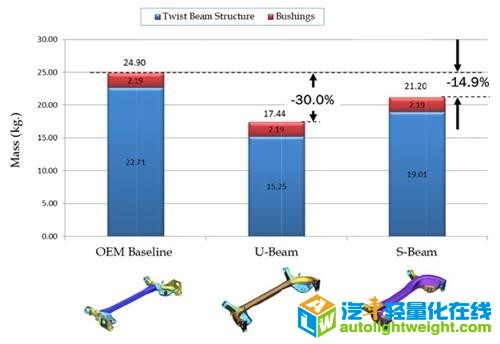 日前,由美国钢材市场发展研究所(SMDI:Steel Market Development Institute,总部位于华盛顿)汽车应用委员会成员以及克莱斯勒、福特汽车和通用汽车员工一同组建的新型轻质扭力梁项目宣布推出其新成果——新型轻质扭力梁悬架结构。 该项目中以22MnB5热冲压钢管结构和DP780双相钢、SPFH540热轧钢板为组成材料的U型结构悬架,其整体重量较普通钢结构相比降低30%,对于年产值分别为30000辆和250000辆车型来说其各自生产成本仅提高约12%-15%。 同时,采用以22MnB5热冲压钢板和DP780双相钢、HSLA550热轧钢板为组成材料的S型钢结构悬架与普通钢结构悬架相比预计可以降低约14.9%的整体重量。而该新型轻质扭力梁项目目的就是为了实现在等效的功能结构和相似的弹塑性情况下降低15%-25%的整体重量,并保证生产成本增长率不超过10%。 另外,在该新型轻质扭力梁项目中钢结构设计主要考虑两个因素:一是在最大扭矩情况下的机械耐久性;二是在最大径向负载下的机械强度。 以上两种钢结构设计方案经过专家制造评估系统和众多相关应用实例的证明是切实可行。在现如今的各种商业应用中,扭力梁结构常被用作产品包装、产品性能、产品质量以及生产成本的基准应用结构。 最初该新型轻质扭力梁项目的设计理念是在可用设计空间基础上对产品空间形状进行最优化设计,通过对各个产品进行不断地优化设计以满足规定的结构要求。 如果不考虑生产制造上的限制,那么最终的产品平面结构将是一种U型桁架结构。该种最优化设计结果被称为“U型梁”结构。而在此基础上再进行挤压成型便得到了上面提到的第二种创新型钢结构设计——“S型梁”。“S型梁”在进行再优化设计时截面被设计为了S形。 “U型梁”结构采用超高强度钢(UHSS:UltraHighStrengthSteel)和先进高强度钢(AHSS:AdvancedHighStrengthSteel),这可以有效减小钢结构厚度,降低整体重量。该结构由热成型横向部件和纵向部件组成,采用22MnB5热冲压钢管结构,厚度保持均匀为2.5毫米。 “U型梁”结构横向部件采用封闭式倒置U形结构,其结构设计目的是为侧倾转向提供基准剪切中心。通过配备后视扫描部件可以实现侧倾转向可调。而考虑到设计简洁性最终设计方案未采用扫描部件。 “S型梁”结构采用热冲压主梁加热冲压小尺寸加强筋结构,材料均采用22MnB5热冲压钢板材料。通过优化设计得到主梁采用S形结构设计。图中“S型梁”结构俯视图整体还是呈现U形结构,这表明最终优化结果与优化目标保持了良好的一致性。 美国钢材市场发展研究所汽车市场副主席Ronald Krupitzer表示:“随着燃油经济性法规的相继出台以及不断丰富,各个汽车生产厂商都在想法设法尽可能的降低车辆的整体重量。该新型轻质扭力梁项目通过利用目前先进钢铁技术优化设计车辆悬架钢结构,不仅降低了车辆整体重量,同时也相应降低了车辆的燃油消耗。” 该新型轻质扭力梁项目由加拿大玛尔梯迈梯克公司(Multimatic,其总部位于加拿大安大略省,主要负责业务包括铰链、铭牌车门和悬架系统、工程服务等)负责。美国钢材市场发展研究所隶属于美国钢铁协会(AISI:American Iron and Steel Institute),美国钢铁协会由24家综合性电炉钢铁制造商以及125家相关供应商和客户组成。美国钢铁协会成员钢铁总产能占美国以及整个北美地区的四分之三还要多。 |