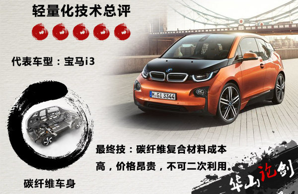 本次华山论剑宝马拿出了看家本领——碳纤维,而最具代表的车型为将在今年即将上市的i3车型。该车采用了宝马“LifeDrive”模块架构,“Life”则代表乘员舱部分,该部分采用了轻量化且高强度的CFRP碳纤维复合材料。碳纤维复合材料成本相对较高,因此售价相比铝合金等钢材要昂贵不少,且不可进行二次利用,因此宝马在此次华山论剑中有着一种“高富帅”的意思。
