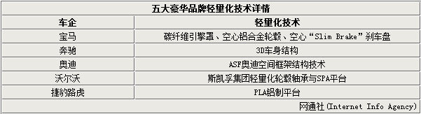 现如今豪华车企互相之间较量的不仅仅是车型的多元化、发动机的小排量化等,这些直观能感受到的变化往往能体现出一款新车在未来市场中的竞争优势。相比外观、动力而言,车重的增加以及降低往往消费者并不能第一时间感觉到,只有在行驶过程中油耗表现才可说明这一点。道理很简单,哪家豪华车企把新车型的车重控制的最轻且非常安全,燃油经济性自然而然就会显著得到提升。 这些轻量化技术通常会使用在换代的车型。在豪华车企中,轻量化技术的应用也并不相同,诸如碳纤维、铝合金等,甚至有些车企在刹车盘等细微零部件上都进行着减重的工作,也可看出豪华车企之间也在无形的较量着,隐约的有一种“华山论剑“各掌一派的意味。下面网通社就为您归纳总结了5家豪华车企在轻量化上的相关技术,这5家车企分别也拥有着属于自己的门派风格,但最终都是达到一个目的——省油。