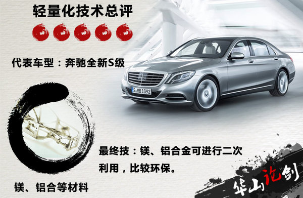 奔驰与宝马的轻量化技术则是截然不同的风格,在奔驰设计师的眼中,任何一款车型都将经过严格的测试,包括应用在新车上的轻量化技术以及部件。据悉,奔驰对于车身轻量化的研究是在建立在3D车身结构基础上的,包括了空气动力学、轻量化以及安全工程三个方面。在轻量化上,奔驰对于车身材料的使用也是根据部位不同采用不同的材料,如前驾驶舱部分必须采用高强度钢材来承受足够的冲击,且有着良好的吸能作用,发动机舱则采用铝制材料打造,将缓冲与前排乘客舱分离开,而车门则采用碳纤维设计,有些并不需要高强度钢材的将用镁合金来代替。奔驰所使用的镁、铝合金材料,最大的优势在于档车辆报废后,原材料还可进行二次利用,充分节约了成本。最具代表车型的当属奔驰全新一代S级轿车,该车的车身结构采用了诸多铝合金元素,充分达到了轻量化节油的目的。
