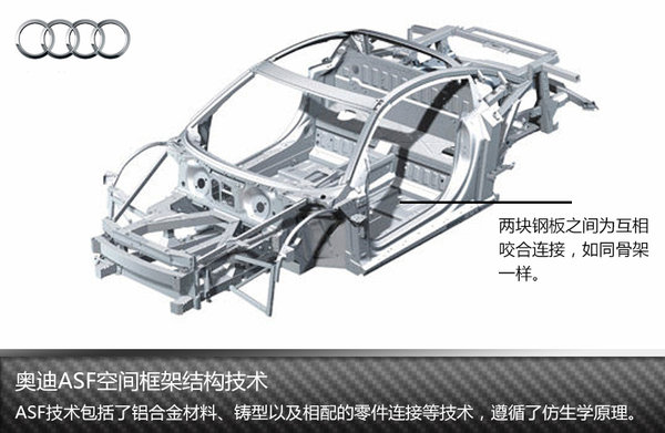 奥迪早在1994年就推出了ASF奥迪空间框架结构技术,该技术已经应用在了A8、TT、R8等多款重磅量产车型中。奥迪ASF技术包括了铝合金材料、铸型以及相配的零件连结等技术,相比传统的车身技术,ASF的重量更轻且安全性也更为出色。据悉,奥迪的ASF技术遵循了仿生学原理,车身骨架由铝制钢材和压铸零件组成,两块钢板之间都是互相咬合链接,犹如一副骨架一样,车身不同部位的零部件材质也均不相同,集成了强量化与安全性为一身。