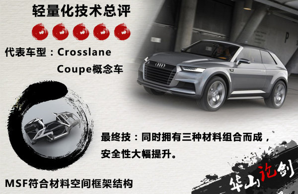 在2012年巴黎车展上,奥迪亮相了一款Crosslane Coupe的概念车,该车也诠释了奥迪在轻量化技术上的优势。这款概念车最致命的武器为MSF复合材料空间框架结构,车体由铝、碳纤维增强塑料以及玻璃纤维增强聚合物构成,根据车体不同部位使用的材料也不同,从而在轻量化的基础上达到了最佳的车身刚性。