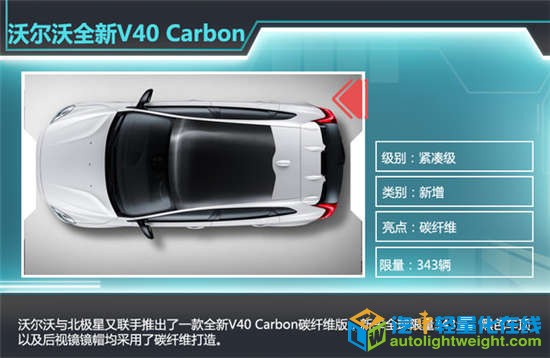 Polestar北极星从1996年开始与沃尔沃合作,先后改装了850(96-97)、S40(98-02)、S60(03-06)、C30(07-现在)赛车,北极星是沃尔沃唯一的御用赛车改装中心。日前,沃尔沃与北极星又联手推出了一款全新V40 Carbon碳纤维版,新车全球限量343量。