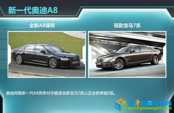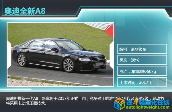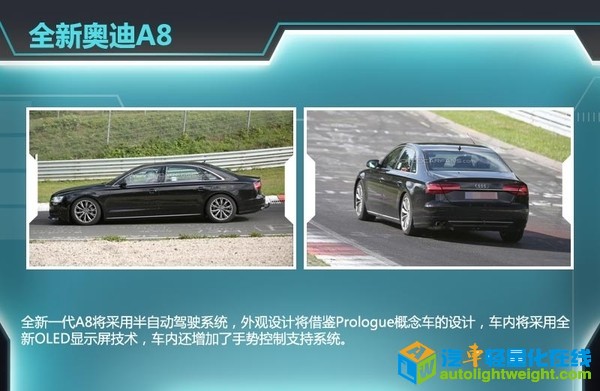 全新一代A8最大的亮点则是其车重降低200kg。另外,随着全球新能源车的趋势主向,全新一代A8还将推出一款燃油更高效的插电式混动版车型以及一款纯电动车型。 |