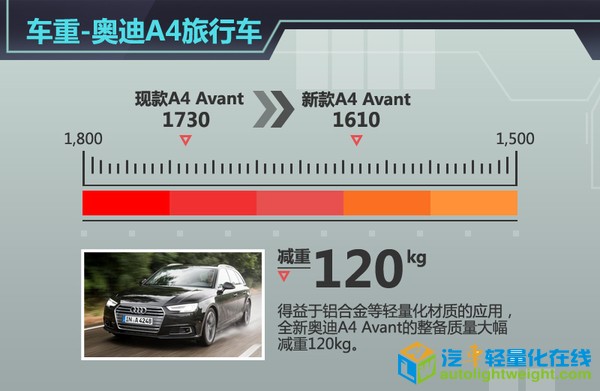 由于全新奥迪A4 Avant采用旅行车的设计方式,因此后轴部分的局部重量将相对于轿车版A4更重。但工程师针对这一不足做出了相应的对策,在采用大面积铝合金材质后,使得全新A4 Avant较现款A4旅行车大幅减重120公斤,从而达到轻量化的目的。