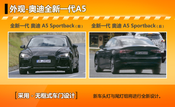 奥迪全新一代A5 Sportback在外观方面与现款车型相似,依旧采用五门掀背式设计,并且流用无框式车门设计。此外,新车不仅在头灯及尾灯方面进行了全新设计,还借鉴了S系列车型所使用的双边四出排气尾管,从而使新车的外形更加动感。 在内饰方面,奥迪全新一代A5 Sportback将采用12.3英寸的数字仪表盘,而8.3英寸的中央显示屏可操作Bang&Olufsen音响系统,并且采用LED光源,使驾乘人员能够享受到更为出众的视听感受。此外,双10.1英寸的平板电也可兼容Android与苹果CarPlay系统。