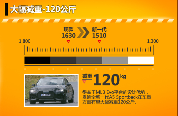 由于奥迪全新一代A5 Sportback将采用最新研发的MLB Evo平台打造,因此新车在综合性能方面均有望大幅提升。而得益于铝合金等轻量化材质的应用,全新一代A5 Sportback在车重方面可大幅减重120公斤,从而提升新车的实际动力表现。