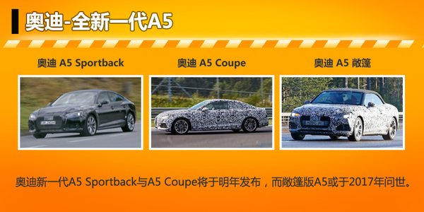 奥迪将在2016年正式发布全新一代A5 Coupe与A5 Sportback车型,但随着以上两款车型的发布,全新一代A5敞篷版车型也有望在2017年进入公众视野,而未来S与RS系列车款也会接踵而至,并助于奥迪丰富A5的产品线阵容。 |