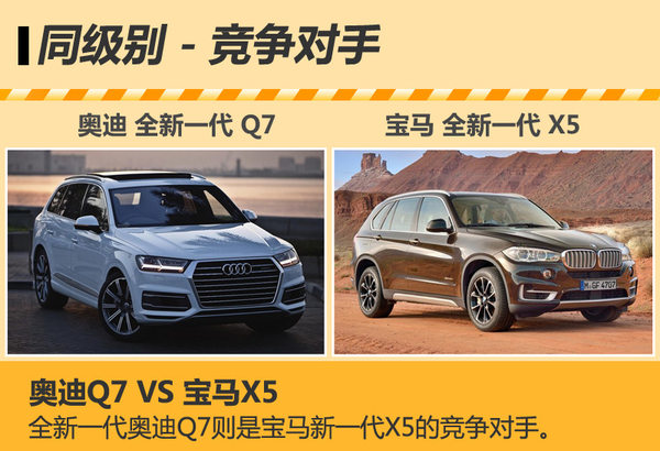 在中大型豪华SUV车型中,全新一代的宝马X5是奥迪新一代Q7的竞争对手。但在两车的较量中,由于奥迪全新一代Q7配备了全时四驱系统,因此在操控表现方面或优于宝马X5所搭载的以后轮驱动为主要动力来源的xDrive系统。 |
