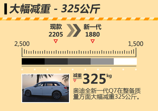 得益于全新平台的研发,奥迪全新一代Q7在车架中采用了大面积铝合金材质,由于铝合金在重量方面具有显著优势,因此奥迪全新一代Q7在整备质量方面有望大幅减低325公斤,仅为1880公斤。