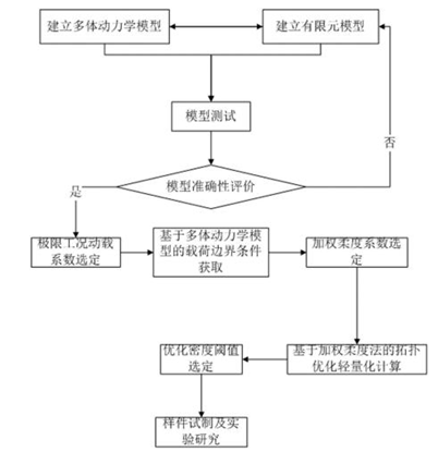 【主权项】: 基于多体动力学技术和拓扑优化技术的汽车底盘件轻量化方法,其特征在于,包括如下步骤:(1)建立轻量化对象车型的整车多体动力学模型和对象零件有限元模型,(2)选取多个典型工况,根据疲劳强度设计要求拟定极限载荷系数,计算车轮受力,并导入多体动力学模型,提取每个典型工况下对象零件的所受等效静载,(3)将步骤(2)中提取的等效静载作为优化边界条件,根据对象车型的实际使用条件,计算每个典型工况的柔度,并选取每个典型工况的柔度加权系数,以加权总柔度为最小为目标函数,以模态和应力为约束函数进行拓扑优化,(4)对于拓扑优化结果选取阈值,指导去除材料的位置。 【法律状态】: