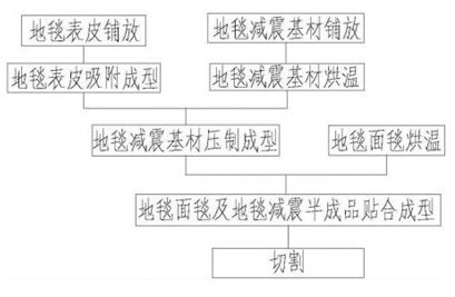 【主权项】: 一种轻量化汽车地毯生产方法,其特征在于,包括以下步骤:步骤1、地毯表皮铺放:将PVC表皮放置在贴合工装上,移送至烘烘箱烘温,调整烘箱加热区温度:310℃?360℃,烘温时间为40s;步骤2、地毯表皮吸附成型:利用贴合工装将步骤1烘温后得到的表皮铺放在吸附模具上,吸附模具压合并进行抽真空吸附冷却成型得到半成品,抽真空吸附吸力为0.8MPa,吸附冷却成型时间为40s,冷却温度为20℃;步骤3、地毯减震基材铺放:将不同厚度的热塑性棉毡铺放在基材贴合工装对应位置上,铺放位置与地毯设计时不同位置的厚度对应一致;步骤4、地毯减震基材烘温:对铺放有热塑性毛毡的基材贴合工装输送入热风箱内进行加热,热风箱的加热区温度控制200℃,加热时间控制在460s;步骤5、地毯减震基材压制成型:利用基材贴合工装将步骤5加热后的地毯减震基材贴合放入成型模具内,将步骤2得到的地毯表皮切割半成品背面喷洒胶水后放于热塑性毛毡上的相应位置,成型模具压合,进行冷却成型,成型压力控制在10MPa,成型时间600s,得到轻量化汽车地毯减震半成品;步骤6、地毯面毯烘温:地毯面毯通过单烘箱悬空式烘箱进行烘温,单烘箱悬空式烘箱的加热区温度控制在500℃,烘温时间控制在60s;步骤7、地毯面毯及地毯减震半成品贴合成型:将步骤7烘温后的地毯面毯放入面毯贴合模具上模,将步骤5得到的地毯减震半成品放置在面毯贴合模具的下模,面毯贴合模的上模下压进行压制冷却贴合成型,得到轻量化汽车地毯半成品,压制冷却贴合成型时,成型压力控制在9MPa,成型时间控制在60s,冷却温度控制在40℃;步骤8、将步骤7得到的轻量化汽车地毯半成品放置在水刀切割机床上进行定位切割,得到轻量化汽车地毯成品。 【法律状态】: