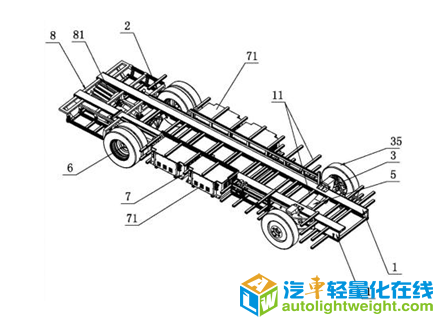【主权项】: 一种采用轻量化客车底盘结构的纯电动汽车底盘系统,其特征在于:包括两条纵向大梁和若干横梁,若干横梁分布于两条纵向大梁的不同高度层面及不同纵向位置,若干横梁榫接于两条纵向大梁形成整体受力的双纵梁多层底盘架;所述双纵梁多层底盘架的前部连接有前桥架,所述前桥架通过两条纵向大梁进行固定;所述双纵梁多层底盘架的后部连接有后桥架;所述后桥架通过两条纵向大梁进行固定;所述前桥架连接有前桥总成,所述后桥架连接有后桥总成,所述双纵梁多层底盘架设置有驱动总成和能源总成。 【法律状态】: