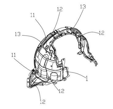 【主权项】: 一种轻量化汽车注塑轮罩,包括轮罩本体(1),其特征在于:所述轮罩本体(1)的基本壁厚为1.0~1.2毫米;所述轮罩本体(1)上的短射和滞留区域设置有导流筋(12),所述导流筋(12)设置在所述轮罩本体(1)的上部和侧面,位于所述轮罩本体(1)侧面的导流筋(12)分为三段,且自所述轮罩本体(1)的侧面延伸至其底部。? 【法律状态】: