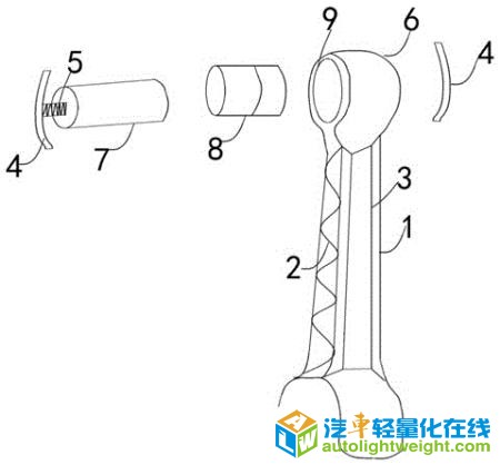 【主权项】: 一种轻量化汽车连杆,包括连杆(1)以及衬套(8)和销体(7),其特征在于:连杆(1)上设置有凸曲线(2)和凹槽(3),连杆(1)小头端(6)的中孔(9)内安装衬套(8)、衬套(8)有销体(7)穿过,销体(7)上设置有拉簧(5)和挡板(4)、挡板(4)与销体(7)通过拉簧(5)相互连接。 【法律状态】: