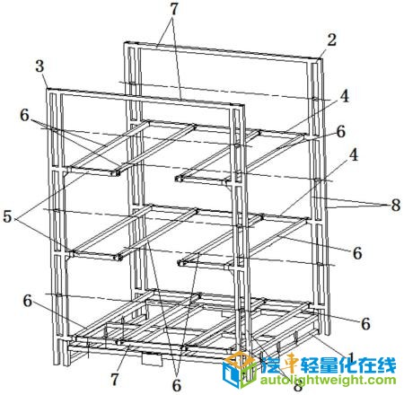 更多著录项目 【摘要】: 本实用新型公开了一种轻量化吸能环保汽车保险杠生产用物料储存架,包括底架及和所述底架可拆卸连接的第一侧架及第二侧架,包括和所述第一侧架上所设第一支杆及第二侧架上所设第二支杆可拆卸连接的连杆,所述连杆两端分别和第一支杆及第二支杆连接构成放置装载汽车保险杠生产用物料托盘的托盘架;第一侧架及第二侧架整体和底架可拆卸连接,第一侧架及第二侧架整体拆装方便;第一侧架及第二侧架上的多个放托盘的托盘架能满足存货量需求,提高了仓储利用率;需要转运货物时,整体方便移动,能减小占用的库存面积,降低保管成本,提高生产效率,能满足生产需求。 【附图】: 【主权项】: 一种轻量化吸能环保汽车保险杠生产用物料储存架,其特征在于:包括底架及和所述底架可拆卸连接的第一侧架及第二侧架,包括和所述第一侧架上所设第一支杆及第二侧架上所设第二支杆可拆卸连接的连杆,所述连杆两端分别和第一支杆及第二支杆连接构成放置装载汽车保险杠生产用物料托盘的托盘架。 【法律状态】: