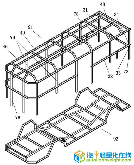 更多著录项目 【摘要】: 本实用新型属于汽车技术领域,具体涉及轻量化巴士车架,包括环绕于车头、车两侧和车尾的环形框,环形框分为车顶环形框、车腰环形框和车底环形框,车腰环形框在车门处留空,车底环形框在放置车轮处向上拱起以容纳车轮;车顶设有多条横梁跨接于车顶环形框的两侧框边之间,还设有纵梁跨接这各条横梁;车底设有多条横梁跨接于车底环形框的两侧框边之间,还设有纵梁跨接这各条横梁;车头、车两侧和车尾均设有多条竖梁跨接上述各个环形框;上述环形框为型材梁,上述各条横梁、纵梁、竖梁均为型材梁。本实用新型结构牢固,采用型材梁且无需过多的连接件,能够同时满足对轻量化、简单和安全的要求。 【附图】: 【主权项】: 轻量化巴士车架,其特征是:包括环绕于车头、车两侧和车尾的环形框,环形框分为车顶环形框、车腰环形框和车底环形框,车腰环形框在车门处留空,车底环形框在放置车轮处向上拱起以容纳车轮;车顶设有多条横梁跨接于车顶环形框的两侧框边之间,还设有纵梁跨接这各条横梁;车底设有多条横梁跨接于车底环形框的两侧框边之间,还设有纵梁跨接这各条横梁;车头、车两侧和车尾均设有多条竖梁跨接上述各个环形框;上述环形框为型材梁,上述各条横梁、纵梁、竖梁均为型材梁。 【法律状态】: