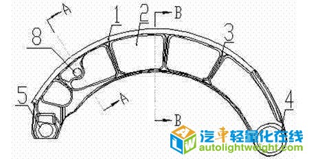 更多著录项目 【摘要】: 本实用新型涉及一种轻量化铸造制动蹄,属于汽车制动技术领域。为克服现有技术中铸造制动蹄重量大的不足,本实用新型提供了一种轻量化铸造制动蹄,包括蹄板和腹板部分,其横向截面为倒“工”字形结构;所述腹板在回位弹簧销孔处采用收紧加厚结构,腹板两侧设置有加强筋,腹板在与滚轮连接端有整圆孔形滚轮轴销孔。本实用新型提供的轻量化铸造制动蹄,重量轻、能有效防止滚轮脱落,实现双回位弹簧的装配以增大回位力,同时能够充分利用制动衬片材料。 【附图】: 【主权项】: 一种轻量化铸造制动蹄,包括蹄板(1)和腹板(2)部分,其腹板(2)上设置有回位弹簧销孔(8)和滚轮轴销孔(5);其特征在于:其横向截面为倒“工”字形;所述腹板(2)包括横向板和竖向板,其横向截面为倒“T”字形,且在回位弹簧销孔(8)处采用横向板收紧纵向板加厚的结构。 【法律状态】: