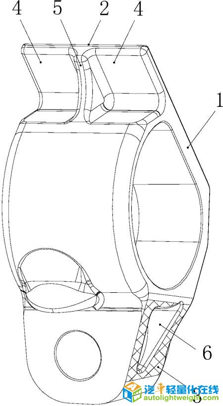 更多著录项目 【摘要】: 本实用新型涉及汽车发动机技术领域,具体地说是一种高性能轻量化悬挂减震支架,包括支架本体(1),所述支架本体(1)的上部设有支撑部(2),所述支架本体(1)下部的侧面设有限位面(3),所述支撑部(2)内侧设有向内凹陷的减重槽一(4),所述支撑部(2)内侧中间位置处设置有加强筋(5),所述加强筋(5)固接在支撑部(2)内侧,所述限位面(3)上开设有向内凹陷的减重槽二(6);本实用新型同现有技术相比,结构新颖、简单,设计合理,通过减重槽减轻了减震支架的重量和体积,降低了产品成本,通过更换材质和改为加强筋结构,使得减震支架的刚性没有受到任何影响,从而实现了在得到同样减震效果的前提下,减少了减震支架的重量,降低了材料成本。 【附图】: 【主权项】: 一种高性能轻量化悬挂减震支架,包括支架本体(1),其特征在于:所述支架本体(1)的上部设有支撑部(2),所述支架本体(1)下部的侧面设有限位面(3),所述支撑部(2)内侧设有向内凹陷的减重槽一(4),所述支撑部(2)内侧中间位置处设置有加强筋(5),所述加强筋(5)固接在支撑部(2)内侧,所述限位面(3)上开设有向内凹陷的减重槽二(6)。 【法律状态】: