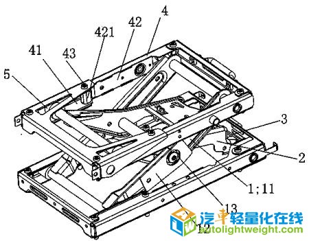 更多著录项目 【摘要】: 本实用新型公开了一种轻量化的悬浮座椅“X型”结构,本实用新型对外铰支架进行压型处理,外铰支架的横截面呈[形结构,外铰支架[形结构的立板呈凹凸形状,外铰支架的外侧焊接有第一加强板,第一加强板位于外铰支架和内铰支架的铰接孔处以及铰接孔下方;内铰支架与横管的焊接位置位于内铰支架的质量中心线,内铰支架与横管的焊接段的长度较现有结构增加300%,在上框体的滑槽与滑块配合处具有翻边,增强零件的抗变形能力,滑槽中间位置加设有第二加强板,增加了滑槽的抗弯强度,第二加强板的头部弯曲绕设在上框体的连接螺栓外周,当紧固连接螺栓时,起到支撑作用。本实用新型通过对汽车座椅悬浮机构结构的更改,在不降低强度的基础上,重量下降了30%。 【附图】: 【主权项】: 一种轻量化的悬浮座椅“X型”结构,其特征在于:其外铰支架(1)横截面呈[形结构,外铰支架(1)[形结构的立板11呈凹凸形状,外铰支架(1)的外侧焊接有第一加强板(12),第一加强板(12)位于外铰支架(1)和内铰支架(2)的铰接孔(13)处以及铰接孔(13)下方;内铰支架(2)与横管(3)的焊接位置位于内铰支架(2)的质量中心线(21),内铰支架(2)与横管(3)的焊接段(22)的长度增加300%,在上框体(4)的滑槽(41)与滑块(5)配合处具有翻边(44),滑槽(41)中间位置加设有第二加强板(42),第二加强板(42)的头部(421)弯曲绕设在上框体(4)的连接螺栓(43)外周。? 【法律状态】: