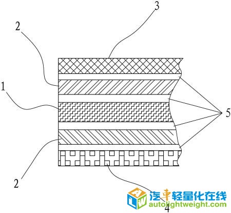 更多著录项目 【摘要】: 本实用新型的技术解决方案是,提供一种以下结构的轻量化汽车备胎盖板材料,它包括用作基板层的PU复合板,PU复合板的上下两面均设有用作过渡层的PP-GF复合板材,上PP-GF复合板材上设有用作包覆层的地毯,下PP-GF复合板材的下面设有隔音毡,上述各层之间经粘接层粘接固定。 【附图】: 【主权项】: 一种轻量化汽车备胎盖板材料,其特征在于:它包括用作基板层的PU复合板(1),PU复合板(1)的上下两面均设有用作过渡层的PP?GF复合板材(2),上PP?GF复合板材(2)上设有用作包覆层的地毯(3),下PP?GF复合板材(2)的下面设有隔音毡(4),上述各层之间经粘接层(5)粘接固定。 【法律状态】:
