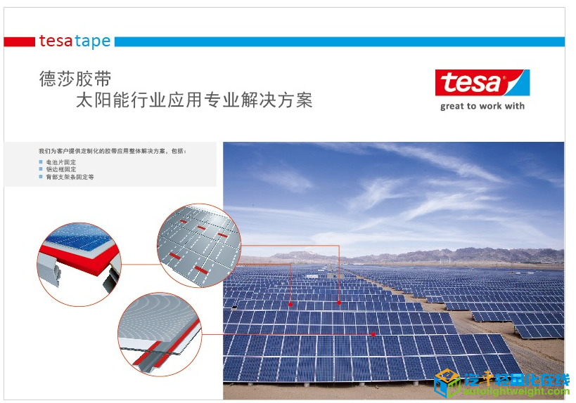 公司简介: tesa SE(德莎公司)是为工业、贸易及消费品领域提供胶粘系统解决方案的全球领先制造商,为太阳能行业提供整体胶带解决方案,包括电池片固定、铝边框固定、接线盒处引线固定、组件玻璃标识、汇流条固定、背梁固定、永久边缘防护等。