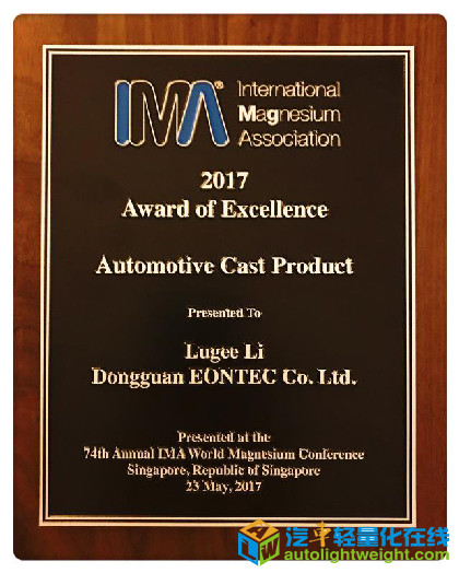 创办于 1962 年的国际镁协优秀奖评选是一项年度行业活动,对于所有镁业领导者来说是一个顶级盛会,目前已连续举办至 55 届,面向在镁应用领域做出突出贡献的所有企业。2017奖项类别包括 4 项:汽车类铸件奖、商业(非汽车)铸件奖、变形加工产品奖、工艺奖。