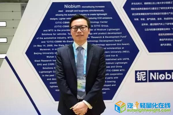 中信铌微合金化技术 助力中国汽车轻量化发展 ——专访中信金属总工程师 郭爱民 教授 铌铁业务部总经理王猛先生 前言:微合金化技术是在普通低强度碳素钢的基础上加入适量的微合金化合金(Ti、Nb、V等)元素,降低碳含量,实现低碳当量的成分设计,通过纯净化冶炼、TMCP(Thermo-Mechanical Control Process:热机械控制工艺)工艺实现组织及精细结构的调控,获得高强度、高韧性及优异焊接性能的材料。在高强度钢和先进高强度钢的发展中,微合金化元素铌具有特殊的作用,它可以通过沉淀强化、晶粒细化、微固溶晶界,从而可以有效地调控组织的细化,组织组成和各种性能,特别是强韧性的匹配优势明显,目前在各类汽车用钢中已有应用。 中信金属有限公司是中国中信集团公司全资子公司,主要从事冶金原材料、冶金产品的进出口贸易和实业投资,经营的主要产品有铁合金、矿产品、钢材、有色金属及金属制品等,铌产品业务是公司的主要业务之一。中信微合金化技术中心在中国积极推广铌微合金化技术及其应用,有力地促进了我国钢铁工业品种结构调整和产品升级换代。铌微合金化技术为汽车用先进高强度钢的产业化应用奠定了坚实的基础,也提升了国内汽车产品的轻量化和安全性水平。 中信金属是如何助力国内汽车轻量化发展的,如何给客户带来核心价值的?为此,中国汽车材料网在中国汽车工程学会年会期间,对中信金属总工程师郭爱民教授,以及公司总经理助理、铌铁业务部总经理王猛先生进行了专访,以下是采访实录: