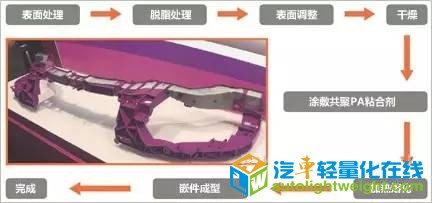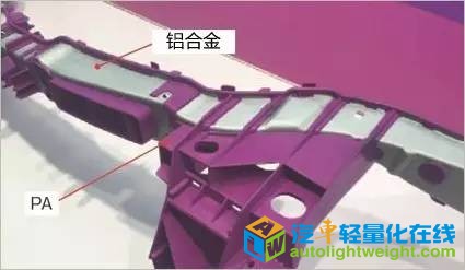 汽车的前端模块通常搭载前灯等大型部件,传统为钢制。新款前端模块将框架材料由钢换成铝合金,并且铝合金与树脂使用粘合剂接合,实现了轻量化。与原产品相比,重量减轻了3.7kg,减轻了约2成(20.9%)。该粘合剂由赢创开发。 新款前端模块要求实现能配备于实车的高设计标准。例如,低速行驶时防止变形、高速行驶时防止前发动机罩打开的耐冲击性,以及即使被划伤或沾上盐水也能抑制腐蚀扩大的耐腐蚀性等,通过了严格的评估测试。 新款前端模块由铝合金框架和利用聚酰胺(PA)成型的部件构成。从两个部件的接合部可以看出,采用了没有螺栓和螺母等连接件的简单结构。以前一直用螺丝在钢制框架上固定树脂部件。 ![]() 新款前端模块FEM的制造方法 1静电涂敷或卷材涂敷 首先,对铝合金实施表面处理,去除氧化膜使表面变粗糙。这是为了提高与树脂的粘合力。接下来,经过脱脂处理、表面调整和干燥等各道工序后,在铝合金表面涂敷共聚PA粘合剂。采用静电涂敷法,用喷枪使共聚PA制粘合剂带电,利用静电在工件(铝合金)表面涂敷该粘合剂。此外,还可以使用在金属卷材上用滚轮高速涂敷该粘合剂的卷材涂敷法,作业人员也可以用刷子涂敷。利用卷材涂敷法涂敷时,有望实现30~50m/分钟的高速处理。 ![]() 2冲压成型 由于共聚PA粘合剂膜会牢牢粘在铝合金表面,可以直接保管,也可以冲压成型。因此,该粘合剂既可以在冲压成型后的铝合金框架上涂敷,也可以在冲压成型前的铝合金板上涂敷。 3嵌件注塑成型 接下来将带有共聚PA粘合剂膜的铝合金放入模具,射出PA进行嵌件成型,前端模块就完成了。成本与之前基本相同。因为省去了用螺丝连接金属框架和树脂部件的成本等。 仪表板横梁CCB上的应用 该技术已经在仪表板的支柱——管梁上实现实用化。由铝合金和PA构成,利用共聚PA粘合剂粘合了两种材料。戴姆勒在3款车型上采用。2013年德国戴姆勒在“梅赛德斯·奔驰A级”上首次采用,之后“梅赛德斯·奔驰B级”和“梅赛德斯·奔驰SLS级”也相继配备。使用的PA为玻璃纤维强化PA6。重量最大减轻2成。 ![]() |