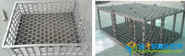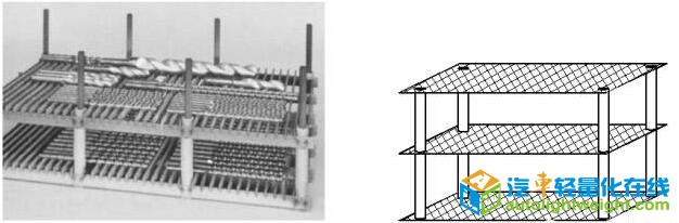 (1)美国使用碳/碳复合材料代替耐热钢制作料架,不仅减轻了料架的重量,而且降低了能耗。料架和栅格的常用制作方法包括结构组合(见图3)和压接(见图4)。碳/碳材料和合金料筐或丝网混合使用也常见。