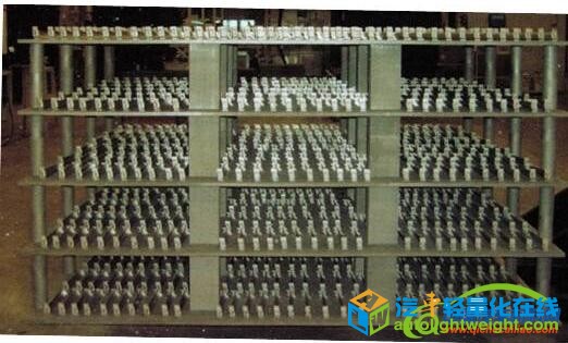 (2)德国西格里碳素集团(SGL CARBON GROUP)西格里特种石墨(上海)有限公司使用碳/碳复合材料代替耐热钢制作料架,不仅减轻了料架的重量,节省了能源消耗,而且提高了使用寿命。图7为用碳/碳复合材料代替耐热钢制作的真空炉料架。
