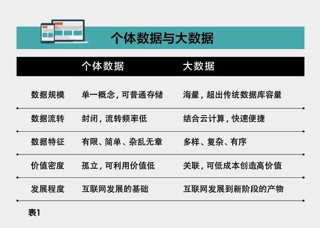 从这个意义上讲,大数据其实就是对(近乎)所有个体数据的整合与处理。因此,个体数据(设计、使用、维护、交流等数据)是构成大数据的基础;而大数据的价值不在于掌握庞大的个体数据,而在于对这些数据进行专业化的处理,以实现对规律和趋势的准确把握和预测。个体数据与大数据的关系可见表1。