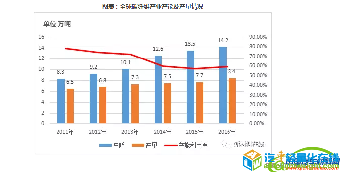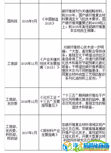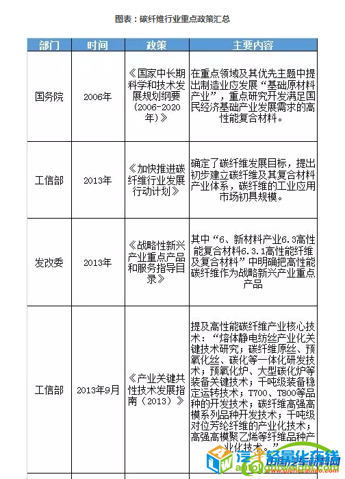 前言 碳纤维是一种高强度、高模量的高性能纤维材料,碳纤维密度不到钢的1/4、强度是钢的5-7倍,广泛应用于航空航天、能源装备、交通运输、体育休闲等领域。经过多年的研发和约十年的产业化建设,我国建立起了自己的碳纤维技术体系和较完整的碳纤维产业,初步形成了产业化的碳纤维研发与生产平台,逐步打破了日、美长期的技术封锁和市场垄断局面。随着国内碳纤维应用领域的扩大,碳纤维的市场需求急剧增加,碳纤维产业日趋成熟。 一、碳纤维行业概述 1、碳纤维行业定义及分类 (1)行业定义 碳纤维是一种高强度、高模量的高性能纤维材料,含碳量90%以上,碳以外的主要元素是氮。作为一种性能优异的战略性,碳纤维密度不到钢的1/4、强度是钢的5-7倍,广泛应用于航空航天、能源装备、交通运输、体育休闲等领域。目前市场销售的90%以上的碳纤维,是以聚丙烯腈(PAN)纤维为原料制成的聚丙烯腈基碳纤维。 碳纤维可以按照原丝类型、制造方法、性能等不同维度进行分类,具体分类方式大致有以下几种: 按照原丝类型分类:聚丙烯腈(PAN)基;沥青基(各向同性、中间相);粘胶基(纤维素基、人造丝基)。 按力学性能分类:高强型(GQ)、高强中模型(QZ)、高模型(GM)、高强高模型(QM)。碳纤维在应用时多是作为增强材料而利用其优良的力学性能,因此使用中更多的是按其力学性能分类。 按丝束大小分类:碳纤维可划分为小丝束和大丝束,小丝束碳纤维初期以1K、3K、6K为主,逐渐发展为12K和24K,主要应用于国防军工等高科技领域,以及体育休闲用品,如飞机、导弹、火箭、卫星和渔具、高尔夫球杆、网球拍等。 通常将48K以上碳纤维称为大丝束碳纤维,包括48K、60K、80K等,主要应用于工业领域,包括:纺织、医药卫生、机电、土木建筑、交通运输和能源等。 2、碳纤维行业产业链分析 完整的碳纤维产业链包含从一次能源到终端应用的完整制造过程。碳纤维产业链上游主要以石油化工行业为主,通过原油炼制、裂解、氨氧化等工序获得丙烯腈;碳纤维企业通过对以丙烯腈为主的原材料进行聚合反应生成聚丙烯腈,再以其纺丝获得聚丙烯腈原丝,对原丝进行预氧化、碳化等工艺制得碳纤维。碳纤维经与树脂、陶瓷等材料结合,形成碳纤维,最后由各种成型工艺得到下游应用需要的最终产品。碳纤维下游应用领域广阔,需求持续增长,碳纤维复合材料被广泛应用于航空航天、体育休闲、汽车、风电等领域,国内进口替代迫切。 3、碳纤维行业管理体制及相关政策法规情况 碳纤维行业系化学纤维制造业,主管部门为工信部原材料工业司;行业自律机构为中国化纤工业协会,主要负责产业及市场研究。 碳纤维作为一种战略性,是国防军工、航空航天领域重要材料,国家必须发展自有技术。自2000年至今,国家密集出台多项产业政策支持碳纤维产业的发展。发改委、科技部、工信部等部门均加大了支持力度。 资料来源:赛瑞研究整理 二、碳纤维行业市场发展概况 1、全球碳纤维行业市场发展分析 碳纤维制备技术发源于日本,经过漫长的技术改进和市场培育,日本、美国实现了对碳纤维核心技术和产业的垄断。20世纪八九十年代,波音公司对碳纤维的需求带动了日本东丽公司的大发展。20世纪90年代,美国国防发展对关键材料碳纤维国产化的要求推动了美国赫氏公司的大发展。日本东丽公司长期占据世界碳纤维行业的龙头地位。多年来,日本的东丽、东邦和三菱丽阳三家企业碳纤维产能最大,从标准模量、中模量到高模量,产品的力学性能品级齐全,品种规格丰富,产品设计紧紧围绕应用领域,成为引领世界碳纤维发展的“三驾马车”。目前全球碳纤维产量约70%产业被日本控制,市场被日本、美国和欧盟控制(80%左右)。 截至2016年底全球碳纤维总产能达14.2万吨,碳纤维产量达8.4万吨。