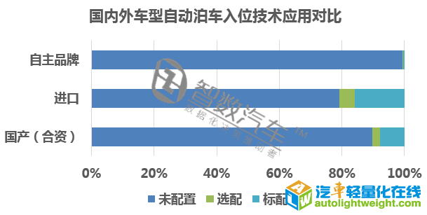 进口车的自动泊车入位技术的配置率最高,达到20.28%;自主品牌车型的自动泊车入位技术应用率较低,配置率为0.56% ;国产(合资车)型的自动泊车入位技术应用率稍高比率为10.28%。