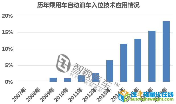 自动泊车入位技术在2009年开始就有了1.27%的应用比例,2009年开始逐渐得到推广,应用比例逐年增加。2017年上市的乘用车中,自动泊车入位技术应用比例达到了18.43%。