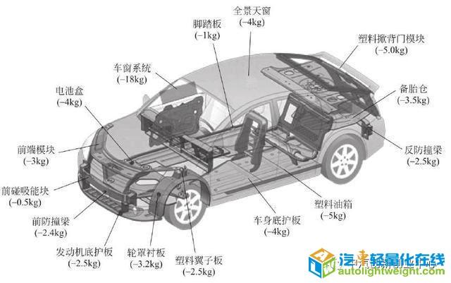 图:汽车外饰件采用轻量化材料减重途径