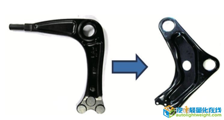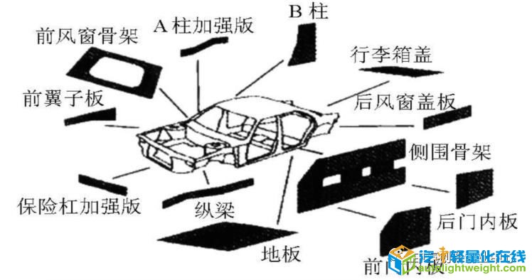 图:三角臂结构变更 例如神龙汽车公司将三角臂结构变更之后(三角臂是在汽车行驶于不平路面时起平衡支撑作用的结构件),质量减轻近50%,制造能耗降低65%。 三、制造工艺轻量化 为进一步达到减重降本的目的,除了开发应用轻量化材料外,一系列适应这些新材料的先进工艺,如热成型、激光焊接、液压成型、差厚轧制、径向锻造、半固态成型等应运而生。 例如,热成型技术是基于高强钢冷冲压成型中普遍存在塑性范围窄、易开裂、回弹大等问题而发展起来的板材成形新技术,通常在900~950°C的奥氏体状态下冲压,并在模具内淬火冷却,汽车上应用热成型技术的典型钢种是22MnB5,抗拉强度可达1500MPa。 激光拼焊是指将几个小零件通过激光焊接集成到一个大的毛坯,进而冲压成形成所需整体部件。使用激光拼焊板可使模具的数量和后续生产工序减少,从而降低了生产成本,并提高了零部件的质量、优化了零件结构,充分发挥了不同强度、不同厚度板材的特性,成为汽车轻化降低零件数量、保证汽车安全、优化设计和改进制造技术的重要手段。