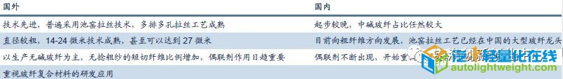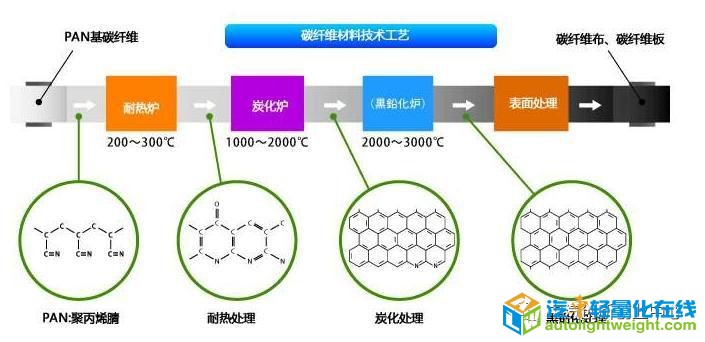聚焦汽车轻量化技术全方位解析||后补贴时代,百公里能耗成关键指标!汽车轻量化材料市场前景广阔 本报告主要关注新能源汽车补贴新政落地后,对轻量化材料市场的影响。在接下来的篇幅中将重点讨论新材料在汽车轻量化的地位以及发展情况。 一、汽车轻量化材料之碳纤维 概述 碳纤维起源可以追溯到1860年,首先由英国人发明。由于其抗高温能力不如钨丝,所以无法成为电灯泡的发光材料,随后碳纤维的研究进入低谷。直到20世纪50年代,碳纤维的研究被美国人在导弹研究领域再一次推上舞台。碳纤维研究的里程碑发生在1959年,日本人近藤昭男发明了聚丙烯晴(PAN)基碳纤维。PAN碳纤维具有工艺成熟,性能良好和低成本等优势,在目前统计情况来看,PAN碳纤维占全部产量的90%以上。在今天的材料领域,如果不特指的话,碳纤维一般都是指PAN碳纤维。 碳纤维是有机纤维经过碳化和石墨化处理得到的微晶石墨材料,其微观结构类似人造石墨,是乱层石墨结构。其含碳量高于90%,如果含碳量高于99%则称为石墨纤维。碳纤维轴向强度和模量高,耐疲劳性好,比热和导电性质介于金属和非金属之间,热膨胀系数小,耐腐蚀,密度低。但是由于碳纤维耐冲击性较弱,容易发生氧化,所以一般需要进行表面处理。