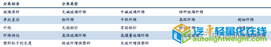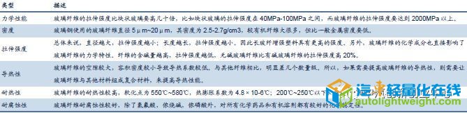 二、汽车轻量化材料之玻璃纤维 概况 玻璃纤维(GFRP)是纤维状的玻璃,化学组成主要是二氧化硅(SiO2)、三氧化二硼(B2O3)、氧化钙(CaO)、三氧化二铝(Al2O3)等。玻璃纤维作为一种性能优异的无机非金属材料,是复合材料中使用量最大的一种增强材料,有着机械强度高、吸收冲击能亮大、耐热性强等优点,能提高基体材料机械强度、弹性模量等力学性能。