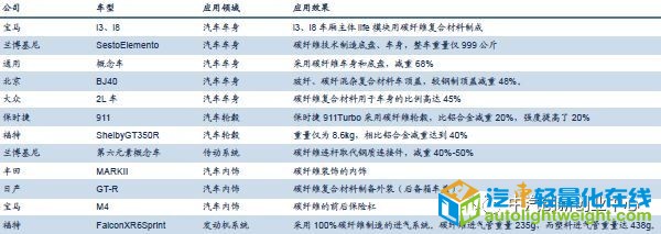 碳纤维在汽车车身、汽车轮毂、汽车刹车、传动系统以及汽车内饰、门窗等多个汽车组件上都有应用。 如宝马在多个系列的车型中使用了碳纤维,例如,在全新宝马7系的车体框架中,碳纤维被用于加固车顶横梁结构、B柱、C柱、底部侧围、中央通道和后部支撑,这些部件以往只能用高强度钢材打造,换成钢和碳纤维混合结构后重量直接减轻50%以上,而且强度是钢的5倍以上,最终7系比上一代减轻了130kg重量;宝马i3/i8Life模块由全碳纤维材质打造,该结构免去了中央通道对内部空间的占用,让乘客拥有更多空间,同时也抵消了高压蓄电池给车身带来的重量,还降低了汽车的重心;保时捷911Turbo采用碳纤维轮毂,比铝合金减重20%,强度提高了20%,且减轻簧下重量,让悬挂反应灵敏度增加、减少转动惯性以及缩短刹车距离。