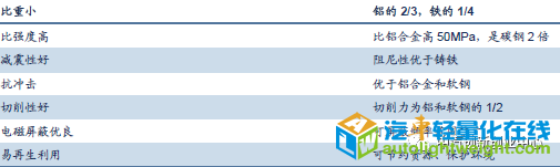 三、汽车轻量化材料之镁合金 优缺点 镁合金是以镁为原料的高性能轻型结构材料,比重与塑料相近,刚度、强度不亚于铝,具有较强的抗震、防电磁、导热、导电等优异性能,并且可以全回收无污染。具体来说,镁合金在汽车生产中有以下几个优点: