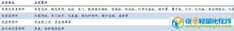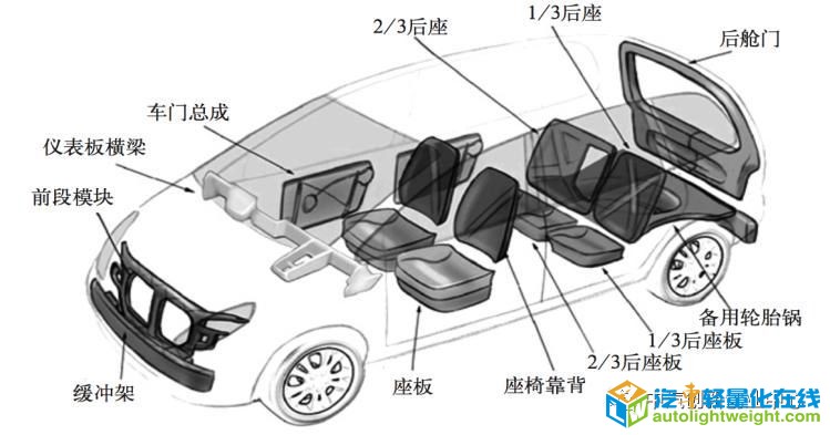图:长玻纤增强材料在汽车零部件中的应用 玻璃纤维毡增强热塑性复合材料 玻璃纤维毡增强热塑性复合材料简称GMT,是目前国际上极为活跃的复合材料开发品种。这是一种以热塑性树脂为基体,以玻璃纤维毡为增强骨架的新颖、节能、轻质的复合材料,一般可以生产出片材半成品,然后直接加工成所需形状的产品,纤维可以是短切玻璃纤维或连续的玻璃纤维毡,热塑性树脂可以是通用塑料,工程塑料或高性能塑料。GMT产品具有很多优异的性能,如耐化学性好,强度/重量比大,在高、低温环境中的抗冲击性能优良。GMT工艺生产的轻质高强度的GMT片材,通过结构优化设计,可取代部分金属材料,获得显著的减重效果,而且节省模具费用,并有利于多种零件组合,形成模块化生产方式。用GMT片材可较原金属件减重30~80%,能耗仅为钢制品的60~80%,铝制品的35~50%。 GMT片材在汽车工业中的应用,已达40多种,主要有座椅骨架、保险杠、仪表板、发动机罩、电池托架、脚踏板、前端、地板、护板、后牵门、车顶棚、行李托架、遮阳板、备用轮胎架等部件。国内已经投产的AuidA6以及A4车已采用GMT材料,但尚未实现国产化。