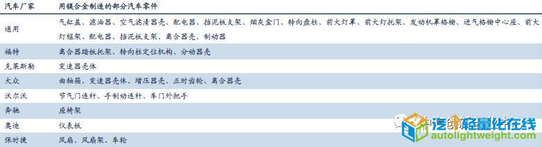 镁合金是最轻的金属结构材料,镁的密度只有1.74g/cm3,是铝的2/3,钢的1/5。采用镁合金能减轻整车重量,在车身、动力总成、底盘和内饰等4个部分进行材料替换,被镁和镁合金替代后的汽车部件减重比例达到20%~70%。
