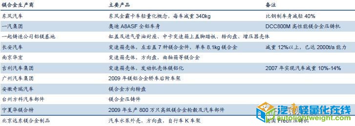 目前,我国镁合金的应用与国外有一定差距。20世纪末,随着轿车工业的兴起,汽车镁合金件才起步。2004年全年510万辆汽车使用镁合金1.8万t,2010年全国汽车达到1806万辆时,镁合金实用6.13万t。目前,我国单车镁合金用量仅在2-4kg左右,低于全球汽车平均每辆用镁合金4~5kg,更低于日本为9.3kg/辆的镁合金用量。国内为汽车行业提供镁合金件的供应商大约60家,生产概况如下表: