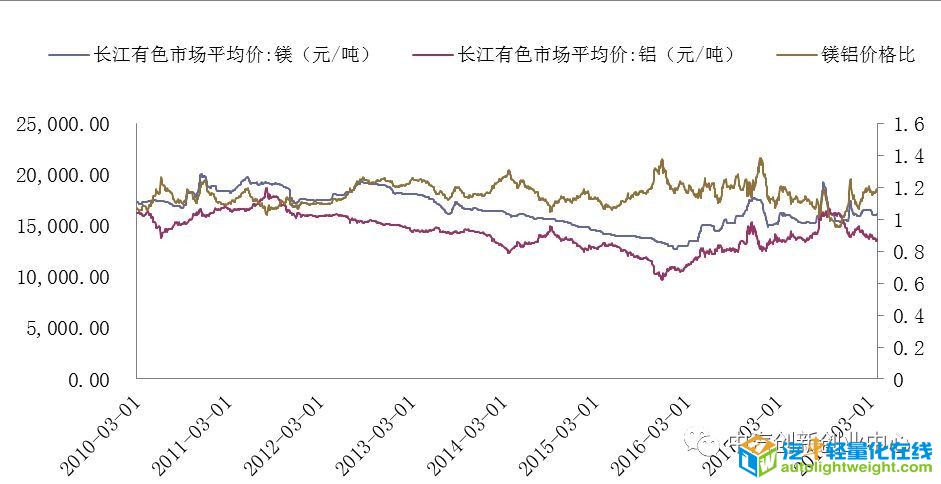 图:不同金属材料的汽车零部件质量对比 相较于铝合金,在成熟产品上镁合金将具备更高的性价比:2018年3月26日,根据长江有色市场平均价,镁的价格为16150元/吨,铝的价格为13670元/吨,虽然镁的价格比铝要高大约18%,但是考虑到镁合金比重较小(镁比重约为1.7kg/m3,铝比重约为2.7kg/m3),相同体积的镁合金成本较铝合金低约34%。