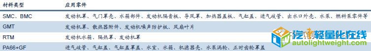 图:镁合金、铝合金价格对比 汽车用镁合金的技术不断突破,应用范围已经逐渐能够与铝合金相媲美,一方面随着充氧压铸、真空铸造和半固态压铸等工艺不断发展,高性能镁合金挤压加工技术、镁合金高效短流程成形技术等技术能有效提高镁合金耐腐蚀性,提高镁合金产品的性能及生产效率,降低生产成本;另一方面现有镁合金压铸件应用范围与铝合金的重合度日渐扩大,随着镁合金的压铸工艺进一步提升,镁合金替代铝合金产品将成为未来汽车轻量化的主要趋势。 四、汽车轻量化材料之树脂 优缺点 树脂基复合材料又称纤维增强塑料(FRO),是以合成树脂为基体,以纤维为增强材料的一种新型复合材料。树脂基体包括热固性树脂和热塑性树脂;增强纤维材料常用的有玻璃纤维、碳纤维、芳纶纤维、高密度聚乙烯纤维等。树脂基复合材料具有以下优点: