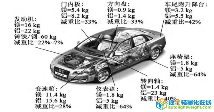 图:采用镁材料替换铝和钢后的汽车减重情况